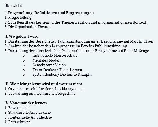 Die Struktur der Arbeit orientiert sich an dem Buch „Theater, Krise und Reform. Eine Kritik des Theatersystems“ von Prof. Thomas Schmidt, der einen ersten alleinstehenden Versuch unternommen hat, Reformvorschläge zu machen, Umsetzungen zu skizzieren und lose miteinander zu verbinden. Der Versuch ist, einzelne Reformpunkte von Schmidt auf ihre Machbarkeit zu überprüfen und sie in konkret-umzusetzende Maßnahmen der Personal- und Organisationsentwicklung umzuwandeln– nach zum Teil kritischer Analyse der Forderungen.